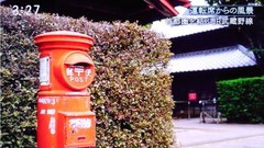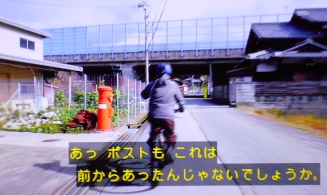 先ほど、12日深夜の録画を見ていましたら、6分43秒に花しょうぶ通り ひこね街の駅 逓信舎(旧:川原町郵便局)横の丸ポストが映りました。
